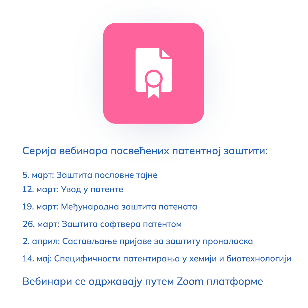 The third webinar is held on Tuesday, March 19, 2024 (10:00-12:00 a.m.) with the topic “International protection of inventions”. Through this webinar the participants shall be presented how the invention can be protected abroad and how to choose a suitable system of protection (national patent application, international patent application or European patent application). In the course of the webinar deadlines for procedures and fees to be paid in the course of the international patent protection shall be presented. Lecturer: Aleksandra Mihailović, Asst. Director, the Patent Sector