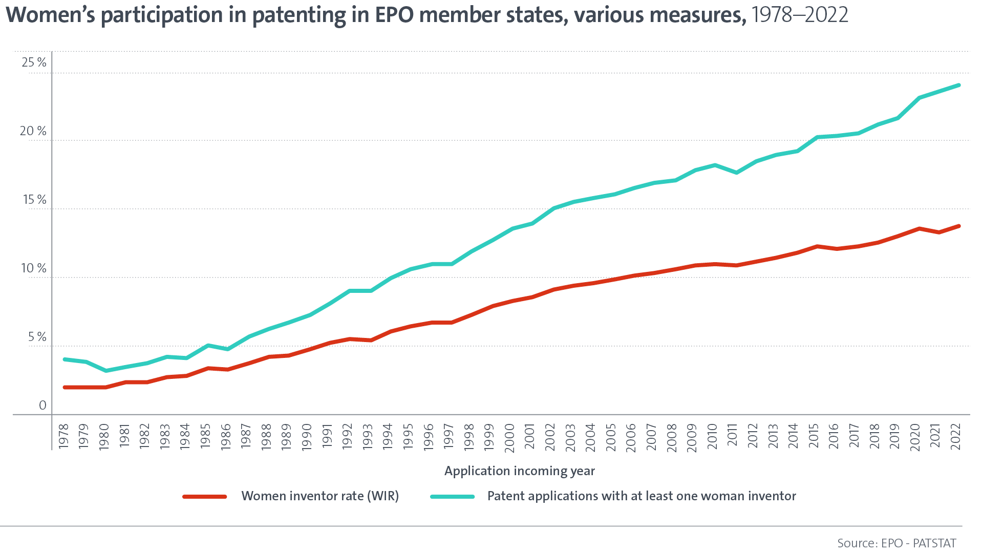 Према подацима из студије, удео жена међу проналазачима наведеним у европским патентним пријавама достигао је 13,8% у 2022. години, што представља благи раст у односу на 13% у 2019. години. Истовремено, удео европских патентних пријава у којима је наведен најмање један женски проналазач порастао је са 21,6% у 2019. на 24,1% у 2022. години, што указује на веће учешће жена у тимском проналазачком раду. Највеће учешће жена забележено је у областима фармације (34,9%), биотехнологије (34,2%) и прехрамбене технологије (32,3%), док је најниже у областима машинских алата (5,7%), основних комуникационих процеса (5,5%) и машинских елемената (4,9%).